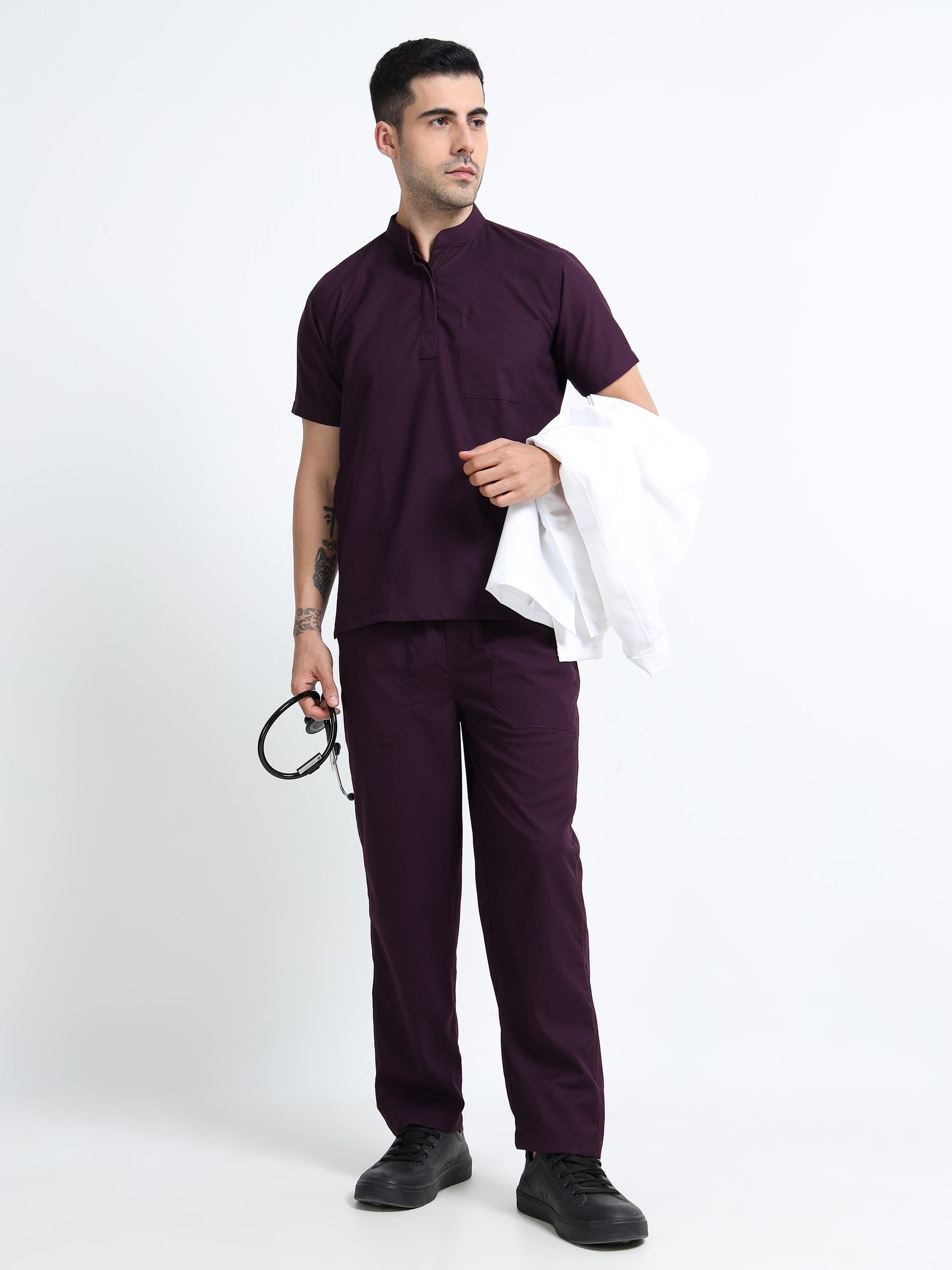 Men’s Wine Medical Scrub Set – Mandarin Collar (Chinese Collar) Top & Straight Pants | 2-Way Stretch, Antibacterial & Wrinkle-Resistant – Apollo